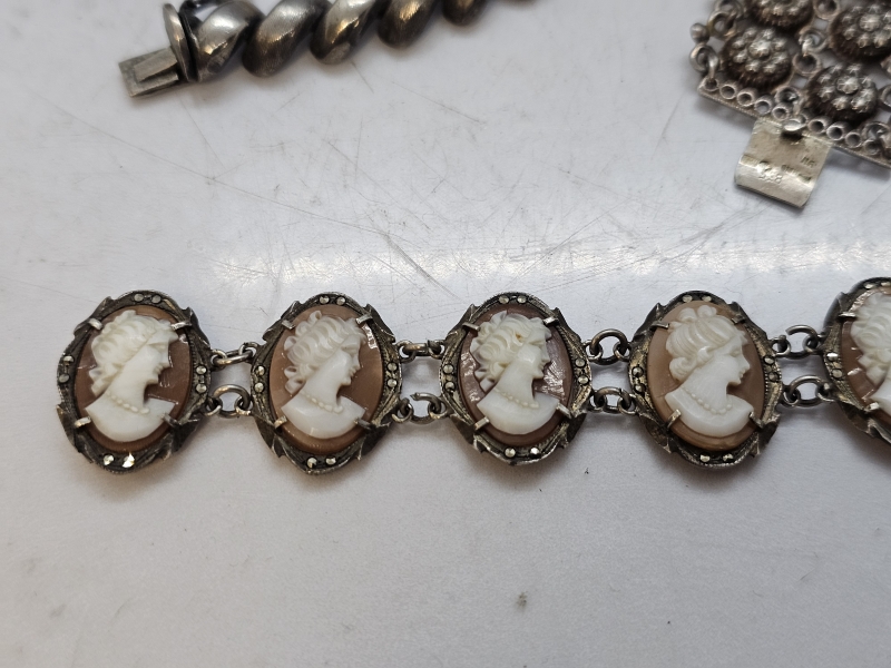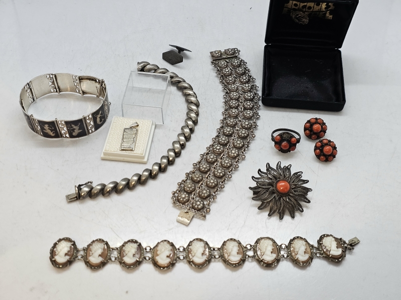 #1591 Erä hopeakoruja: Mm. niellokoristelu, camee rannekoru ym.