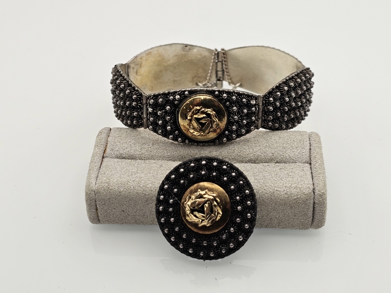 #1592 Hopeinen rannekoru & riipus / rintaneula kultaisilla koristeilla