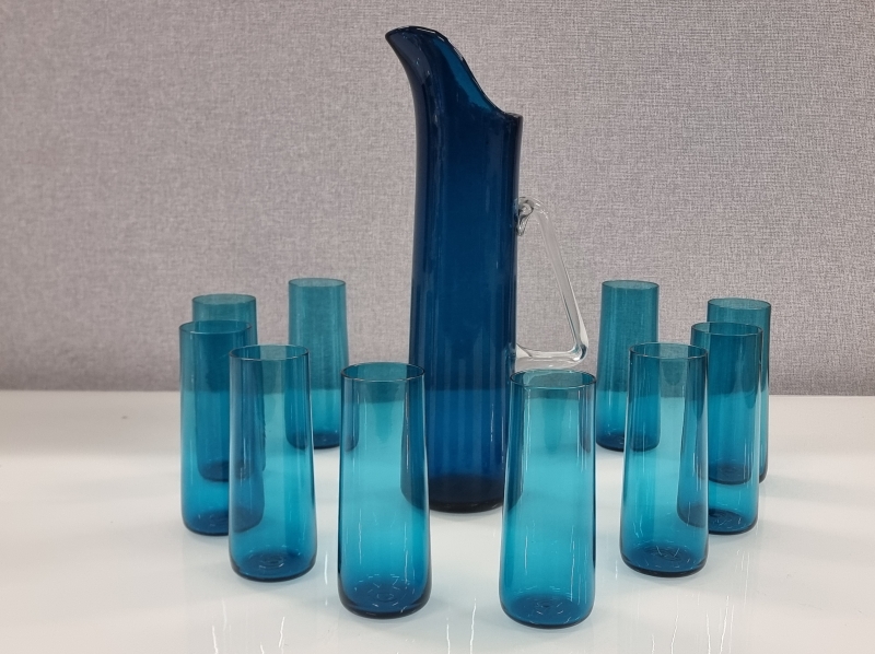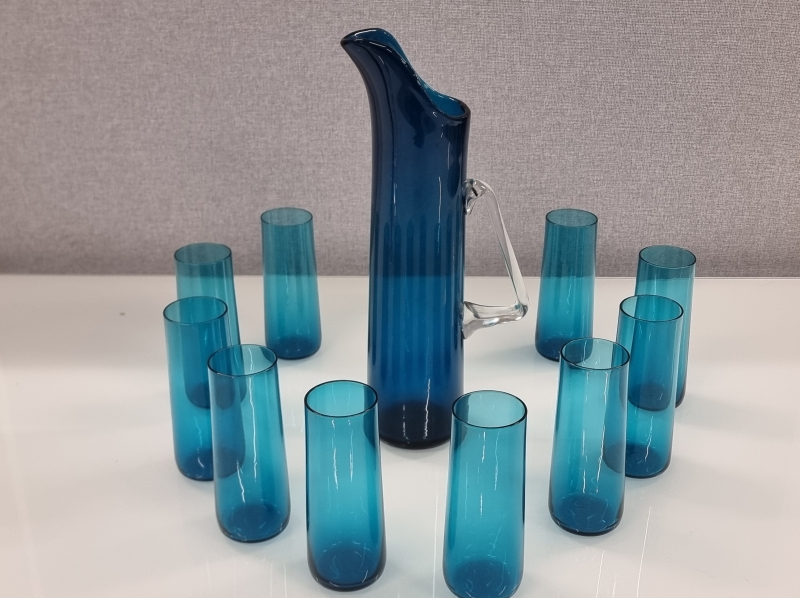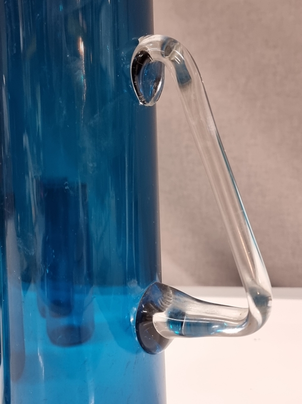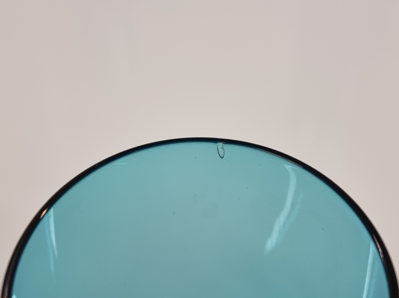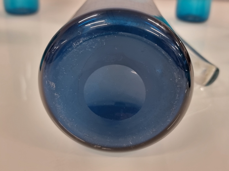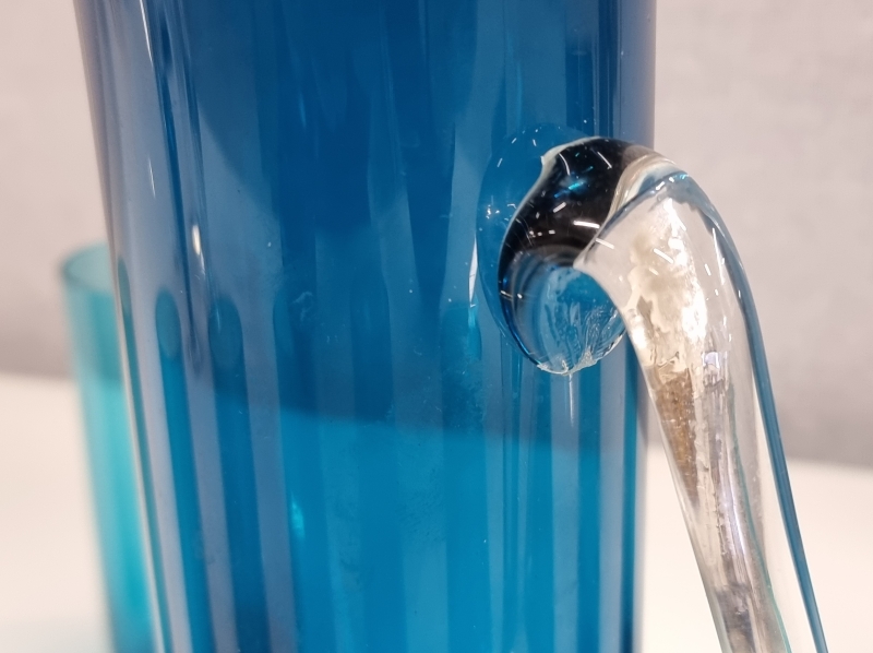 Yhdessä lasissa puhjennut kupla reunassa. Kaatimen korkeus 35cm. Lasin korkeus 15cm.