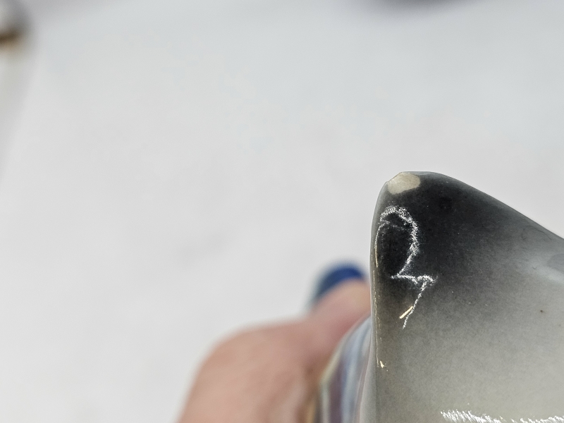 Hatun reunassa ja linnun pyrstössä pienet kolhut. Korkein 18,5cm