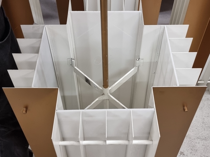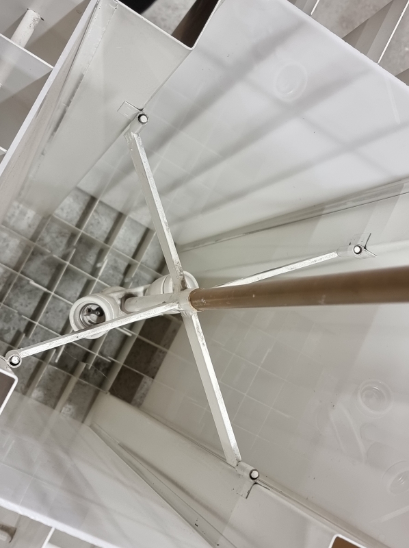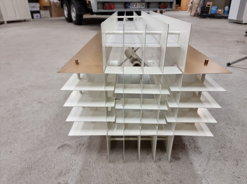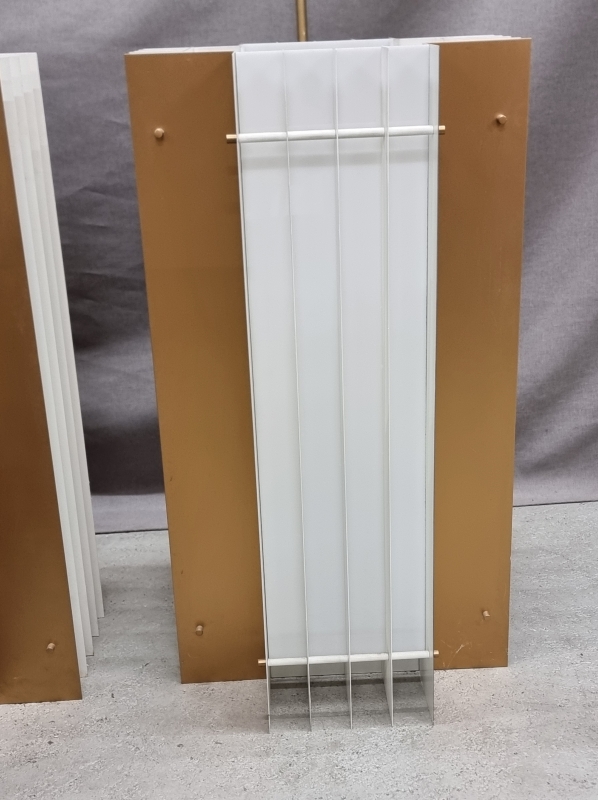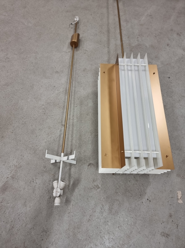 Metalli/akryyli. Varsi helposti lyhennettävissä. Puhdistusta vaille. Valaisinosan korkeus 87cm, leveys 48cm. kokonaiskorkeus 240cm