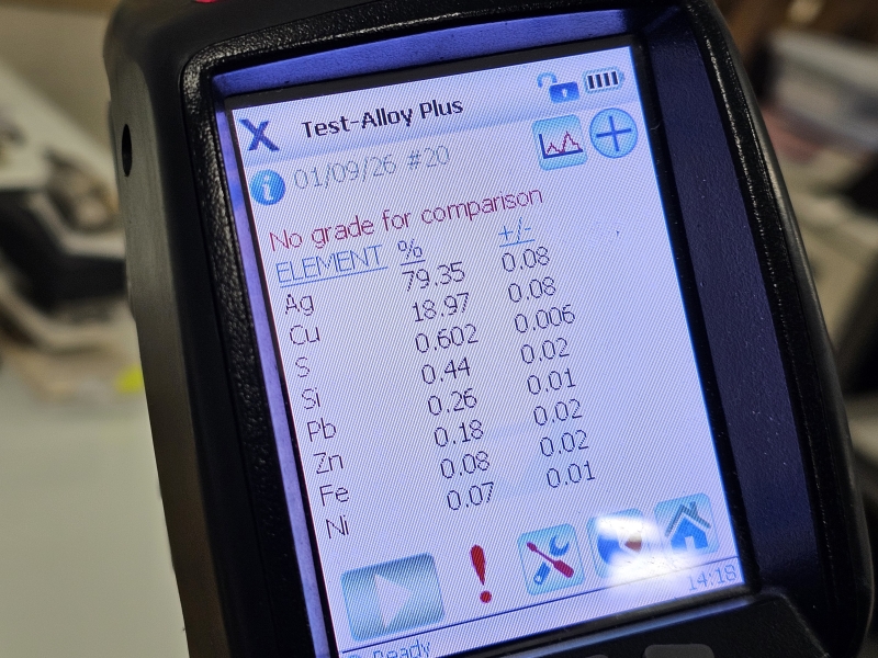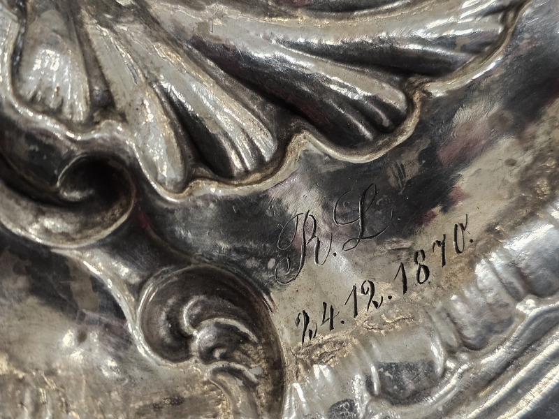 Ei leimoja, todettu XRF-laitteella n. 800/1000 hopeaksi. Paino 1060g. Korkeus 24,5cm