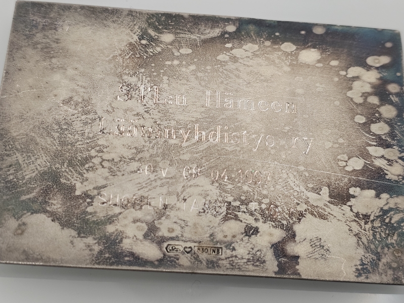 Paino 192g. Takana kaiverrus. 9,4cm x 6,5cm