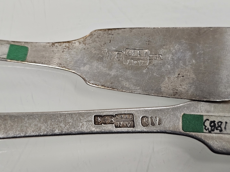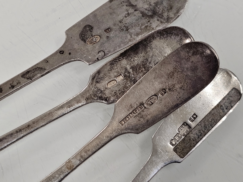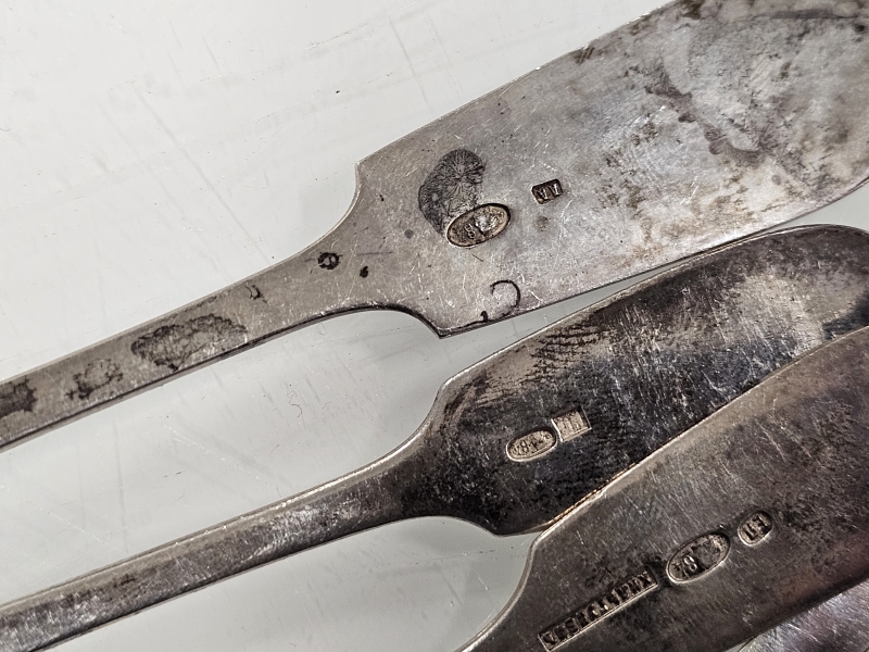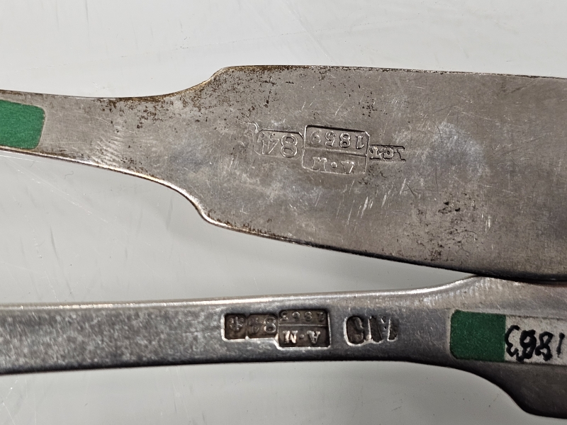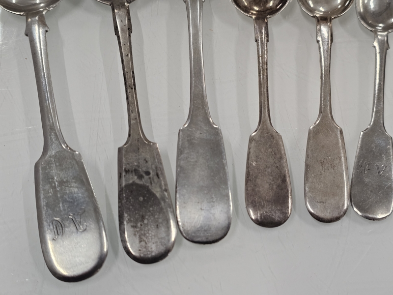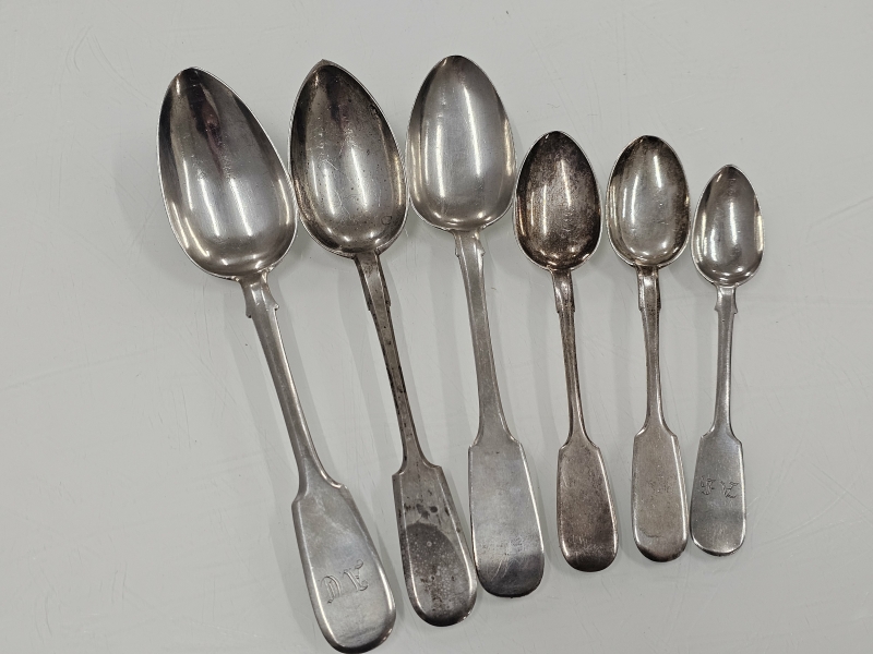 #1200 - 6kpl hopeisia venäläisiä isoja lusikoita joista vanhin vuodelta 1859. 281g