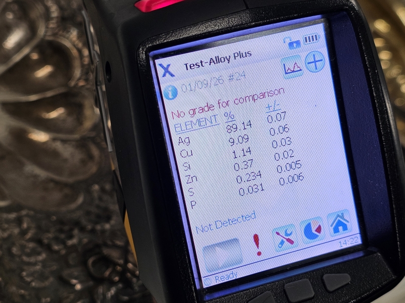 Paino 1385g. 41,5cm x 33cm, korkeus 14cm. Kuvissa XRF-laitteen testitulos, pitoisuus noin 890/1000