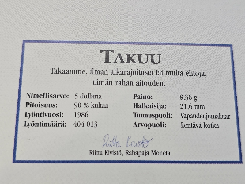 #1223 Kultakolikko: Vapaudenpatsas 100v, 8,36g