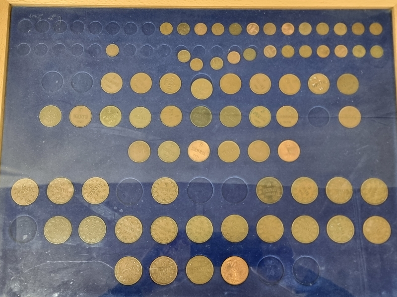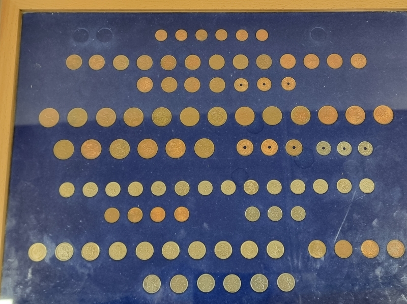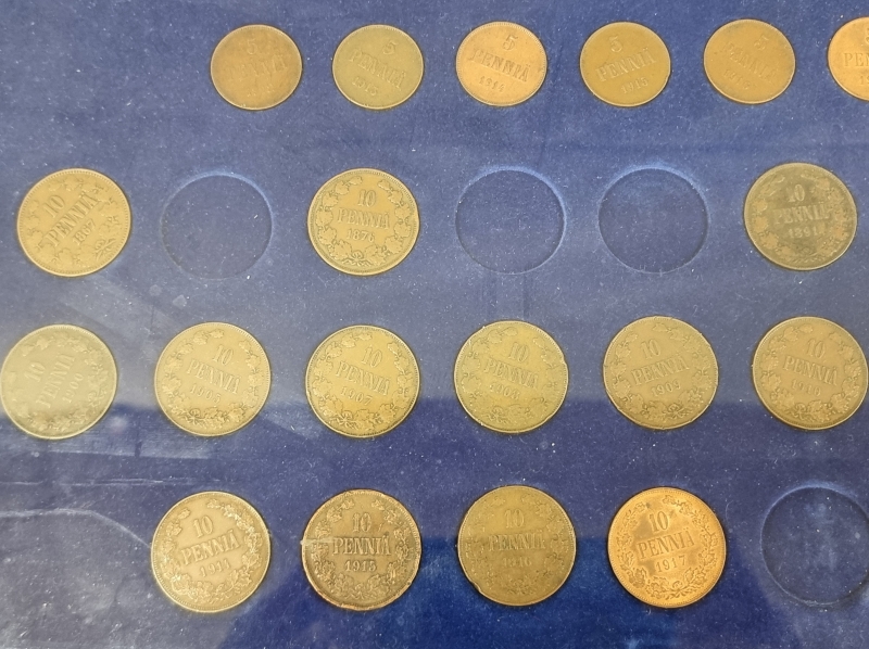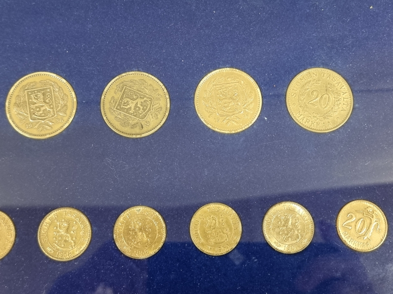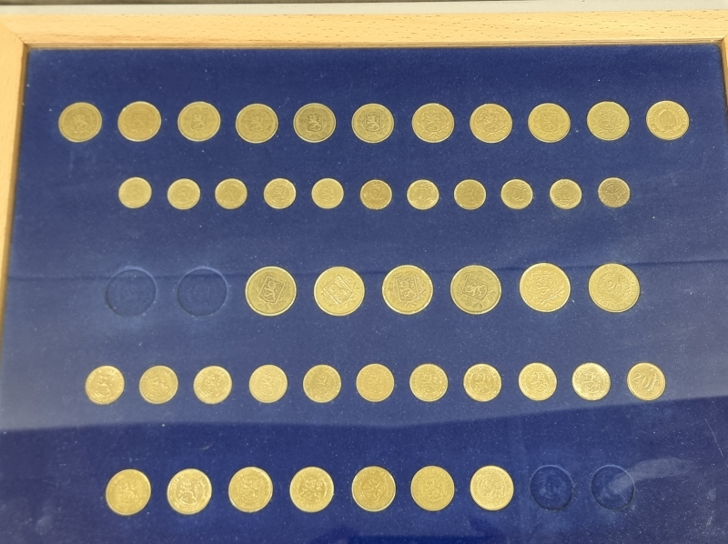 #2216 Suomalaisia kolikoita vitriineissä ja säilytyslaukku