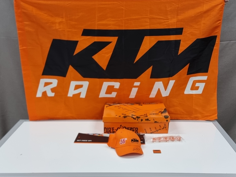 #2209 - KTM -tavaraa: Lippis, naulakko, putkihuivi, lippu ja magneetti