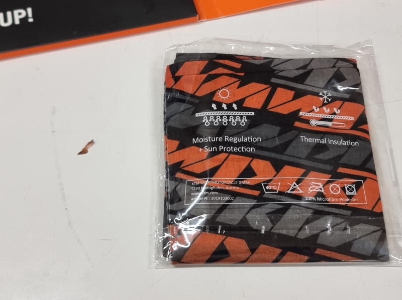 #2209 KTM -tavaraa: Lippis, naulakko, putkihuivi, lippu ja magneetti