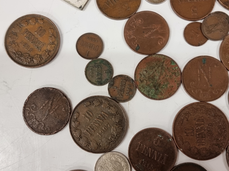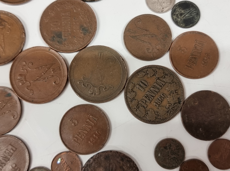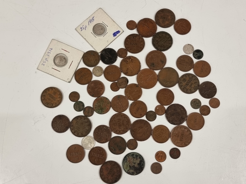 #1124 Erä vanhoja suomalaisia kupari ja hopeakolikoita: Mm. 25p 1915 ja 10 penniä 1866