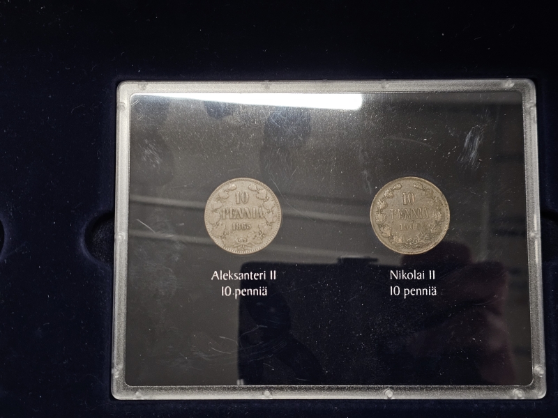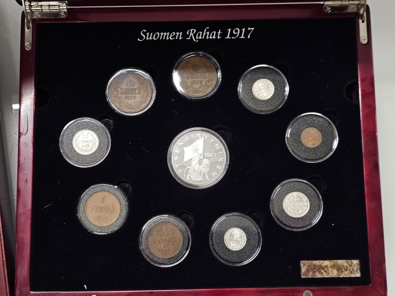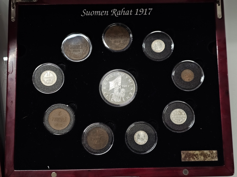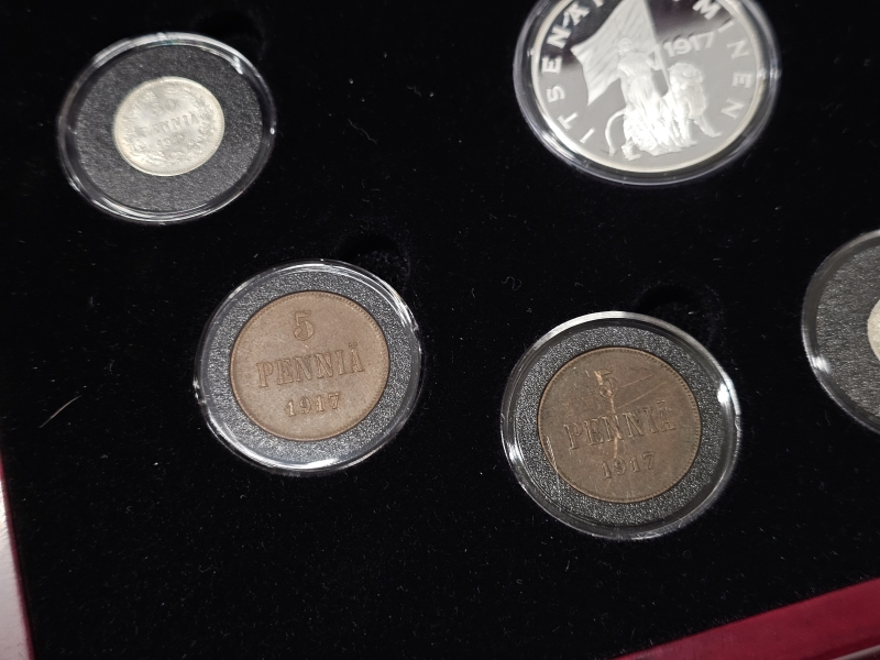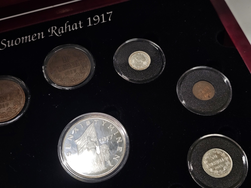 #1138 - Suomen rahat 1917 kolikkokokoelma [osa hopeaa] + vanhat 10p kolikot rasiassa