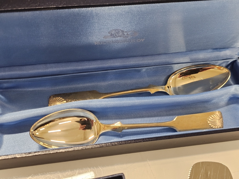 Lusikat 66g, teräskärkisten ottimien bruttopaino 327g. Kakkulapiossa kaiverrus