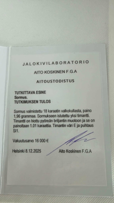 Mukana aitoustodistus. Ei kaiverruksia. Koko 17. Bruttopaino 1,96g