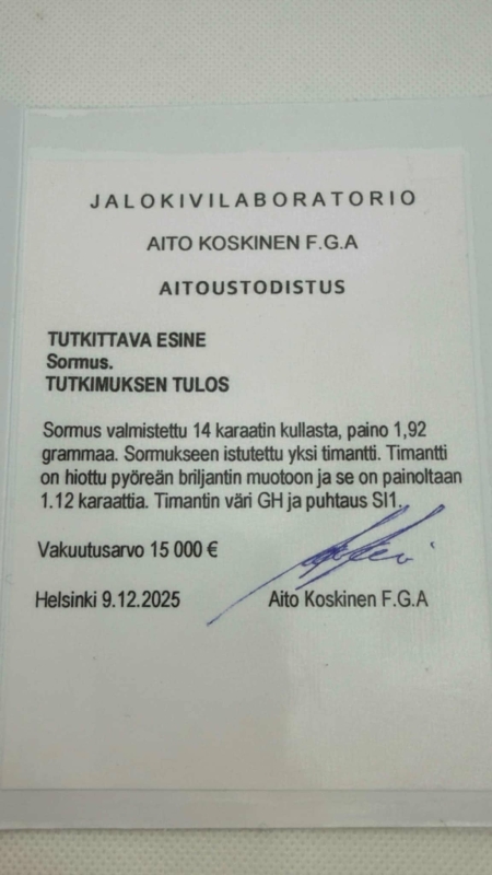 Mukana aitoustodistus. Todistuksessa merkitty kullan paino ilman timanttia. Ei kaiverruksia. Koko 17