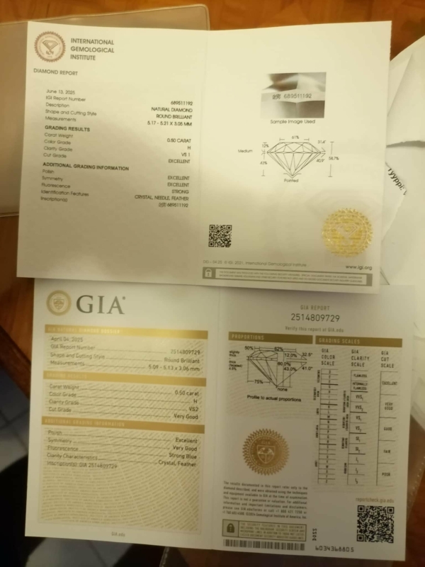 Bruttopaino 0,68g. Mukana sekä IGI että GIA -todistukset. Timantissa lasermerkitty sertifikointinumero
