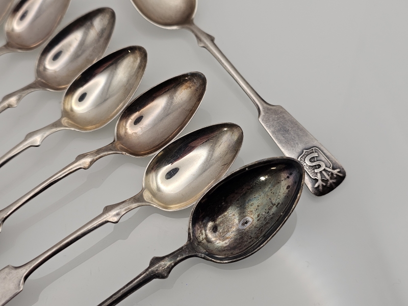#1320 - Hopeisia Musla -sarjan kahvilusikoita joista yksi Suojeluskunta. 80g