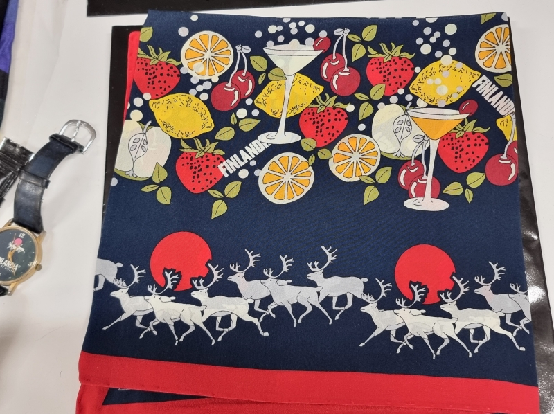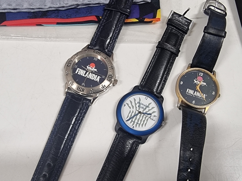 #2454 - 3kpl mainoshuiveja + 3kpl rannekelloja. Finlandia-vodka ym.