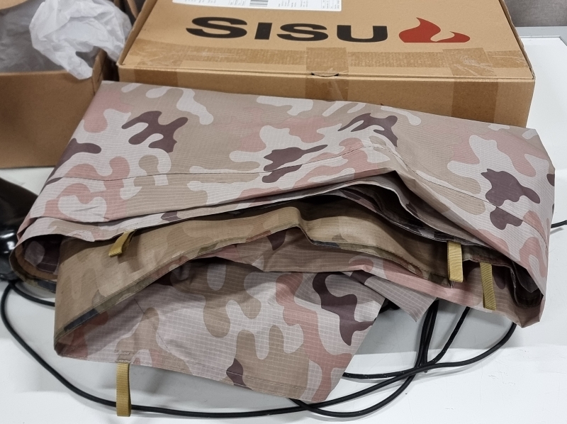 #2242 2 paria Sisu kumisaappaita + maastokuviollinen sääsuoja