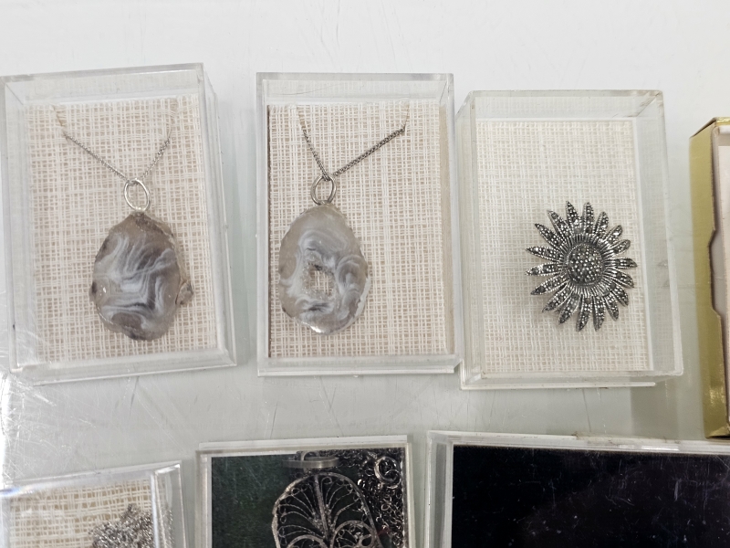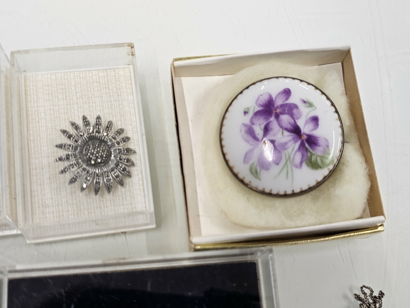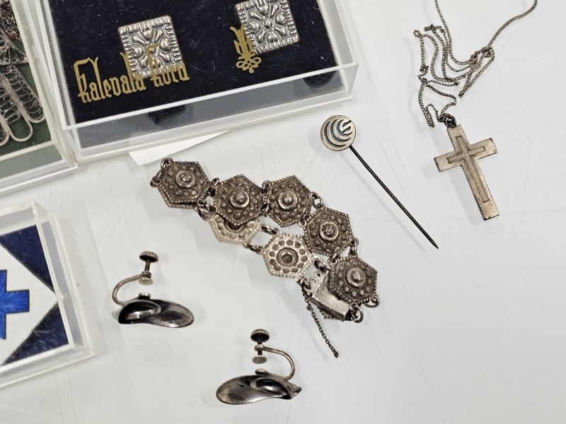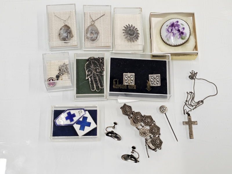 #1376 - Erä koruja joista osa hopeaa, mm. mielisairaanhoitajan merkki