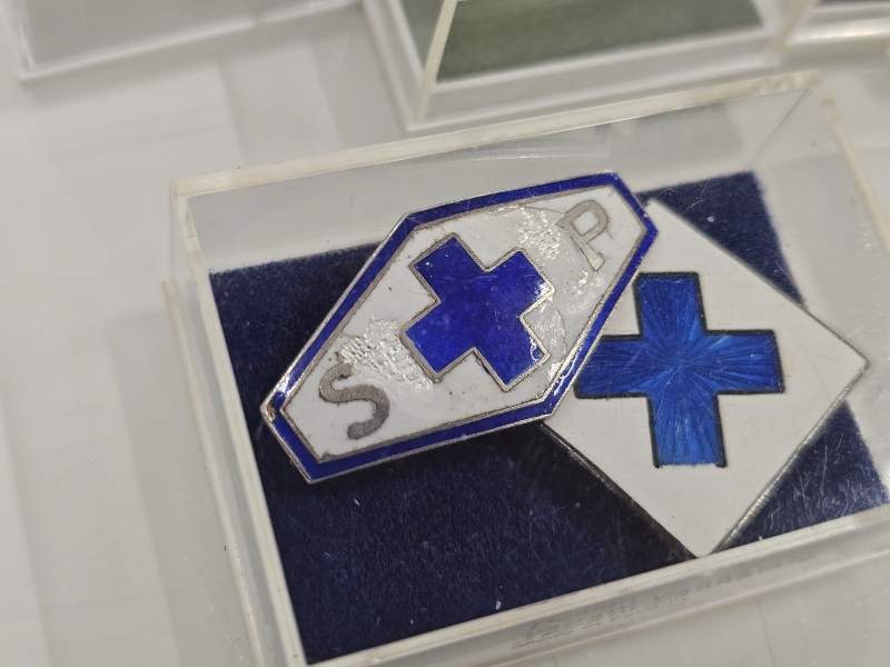 #1376 Erä koruja joista osa hopeaa, mm. mielisairaanhoitajan merkki