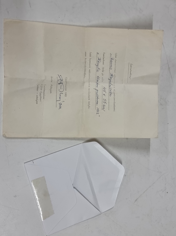 Mukana luovutuskirja. Kehyksineen 73cm x 63cm