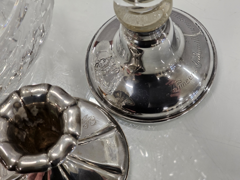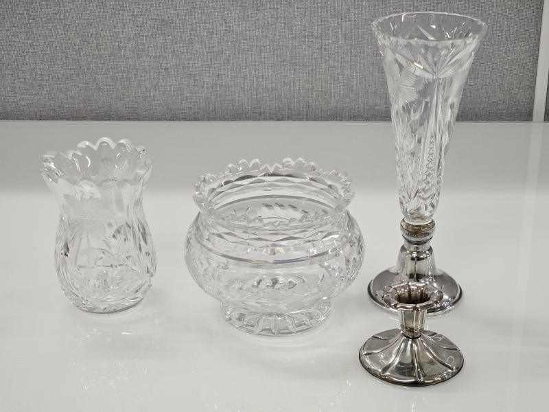 #1387 Hopeinen kynttilänjalka + kristallimaljakko hopeajalalla + 2kpl kristallimaljakoita