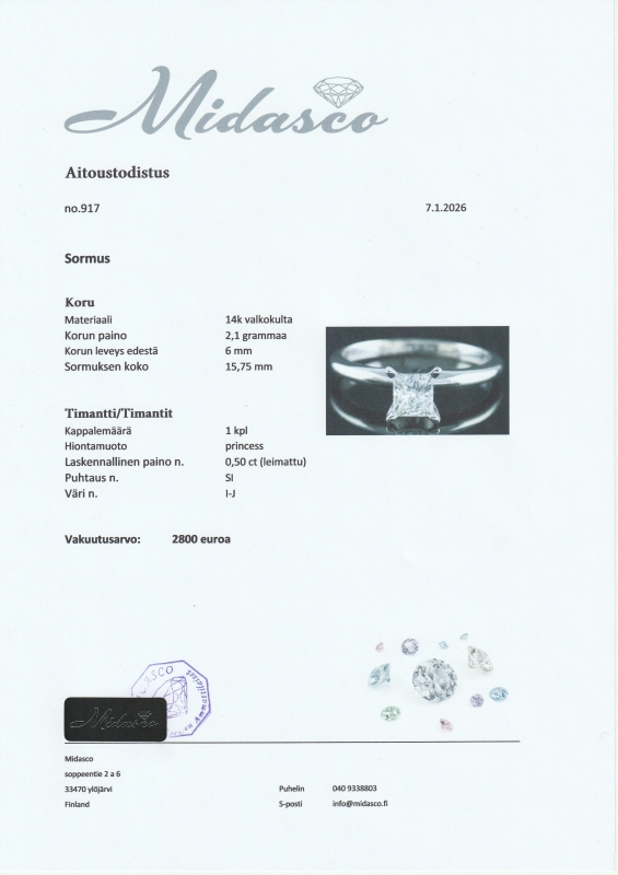 #1129 14k valkokultainen timanttisormus (yht. 050ct) 2,1,g