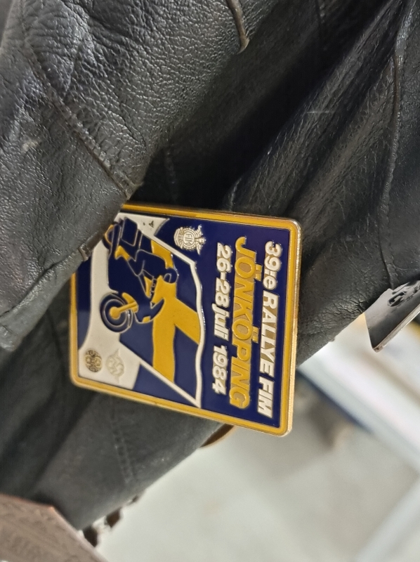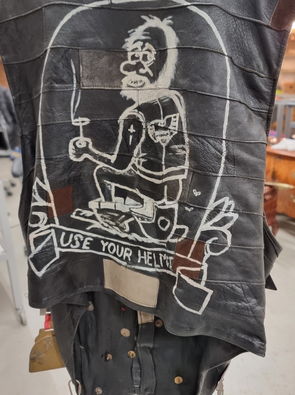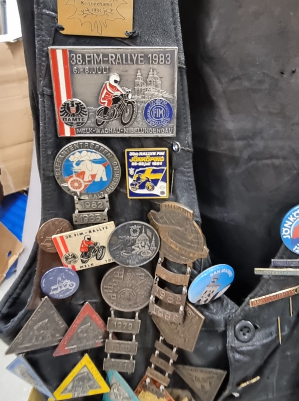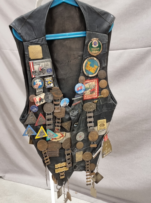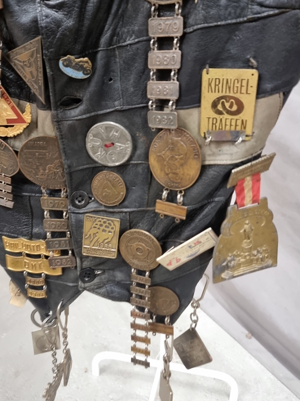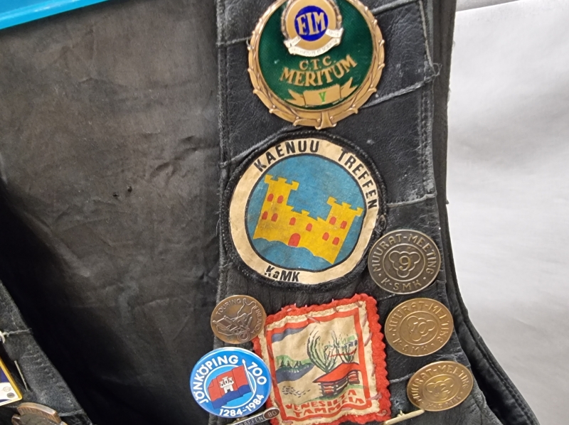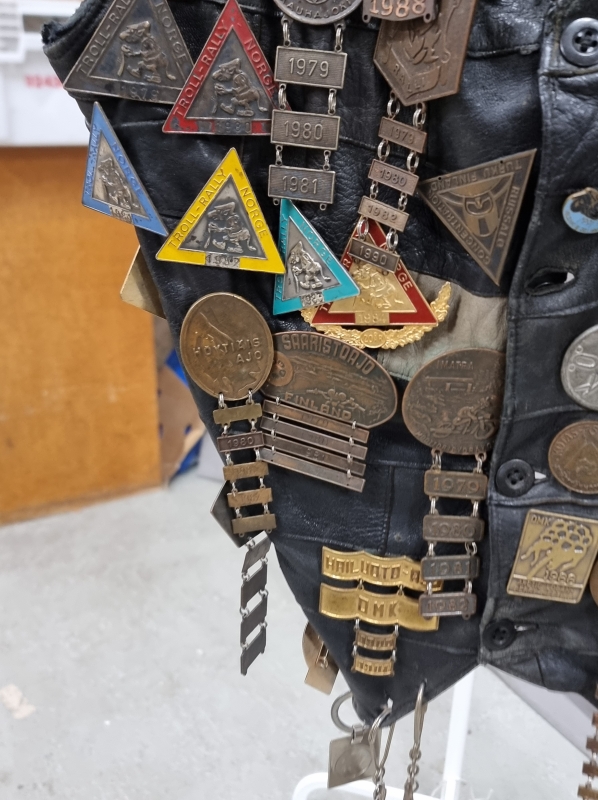 #2051 - Nahkaliivi runsailla merkeillä. Kontio- , Kokko- ja Kauharalli ym.