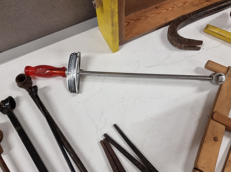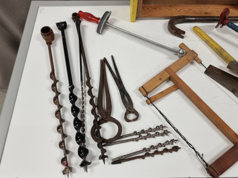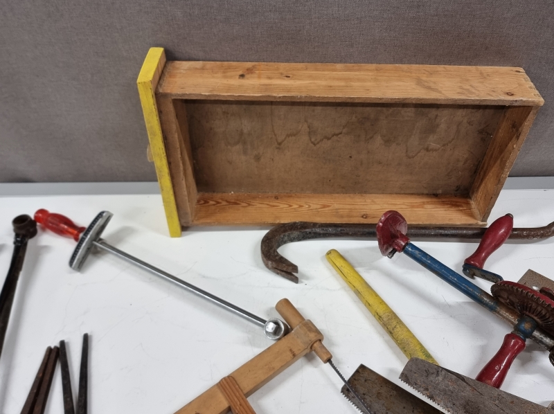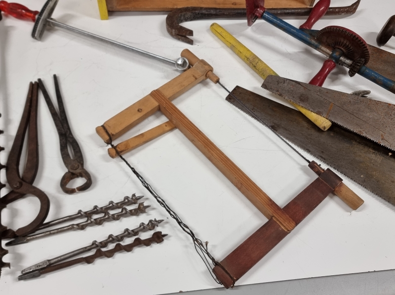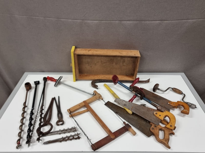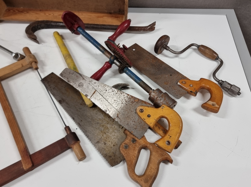 #2533 Erä työkaluja. Pora, sahoja, sorkkarauta ym.