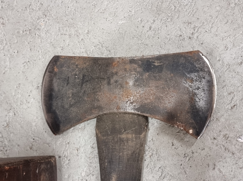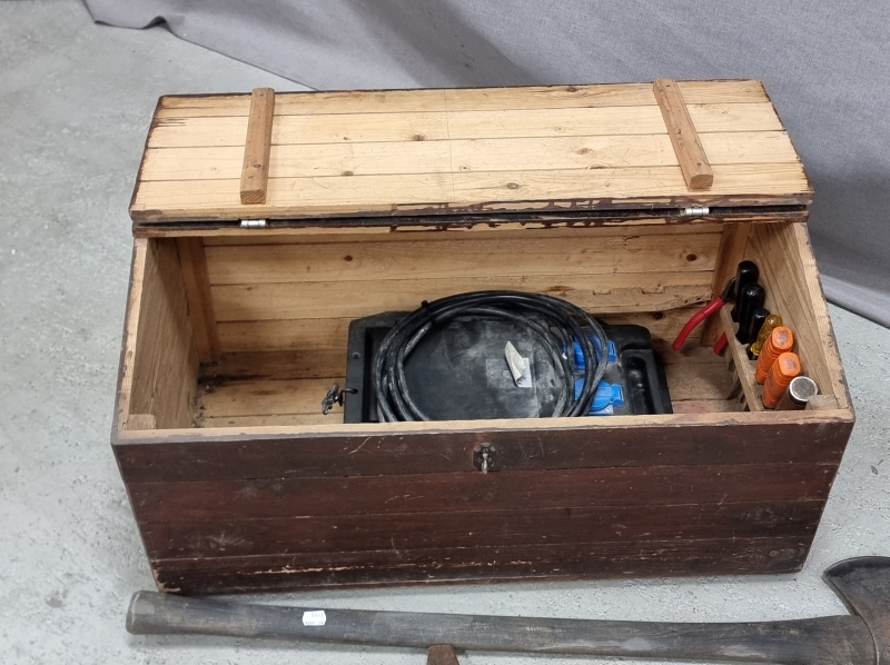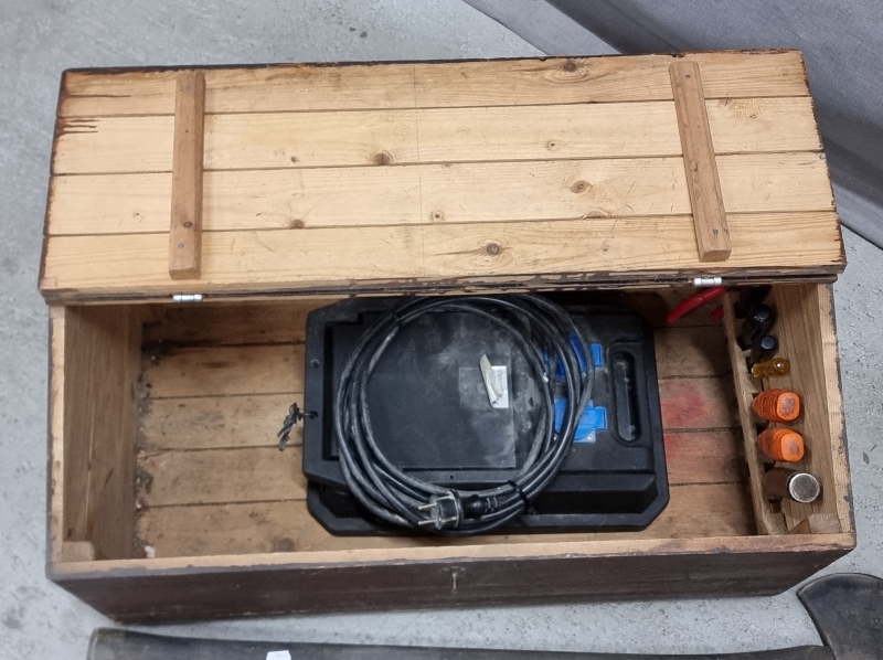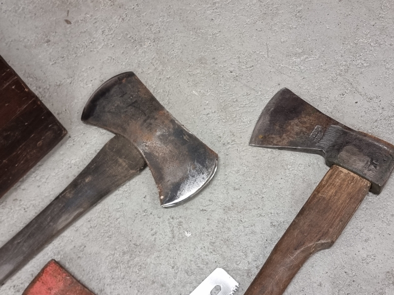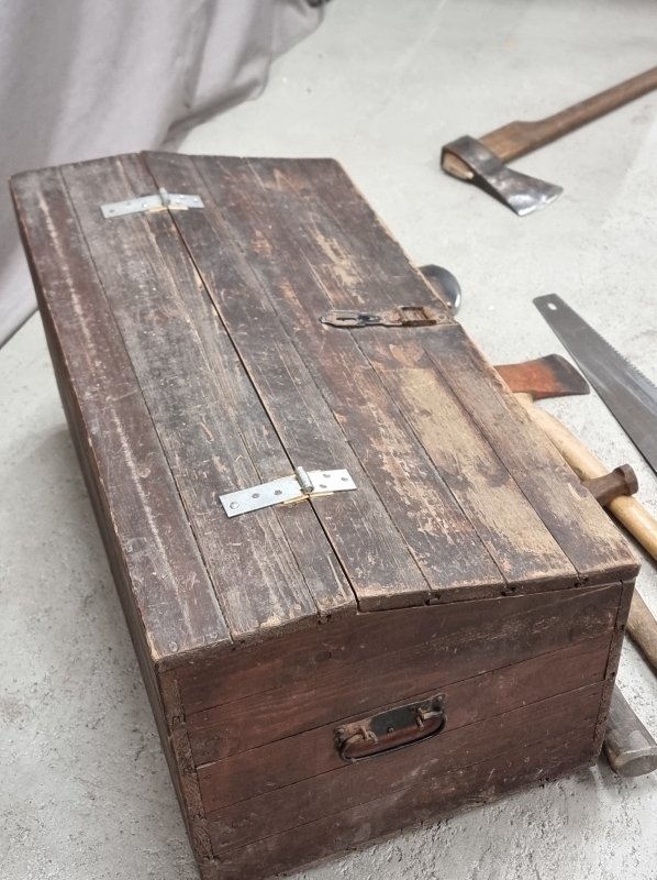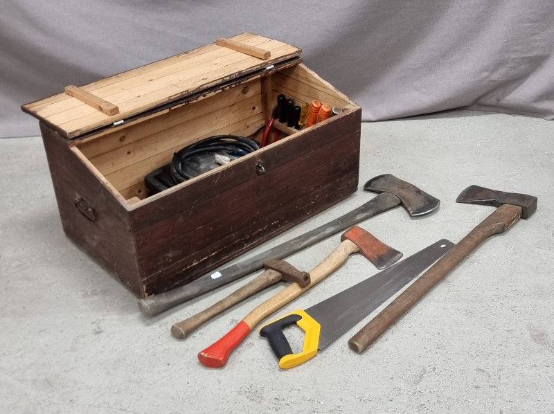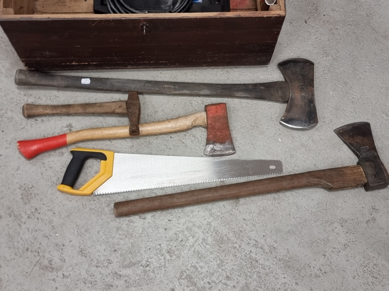 #2534 - Erä työkaluja: 3kpl kirveitä, iso puulaatikko ym.