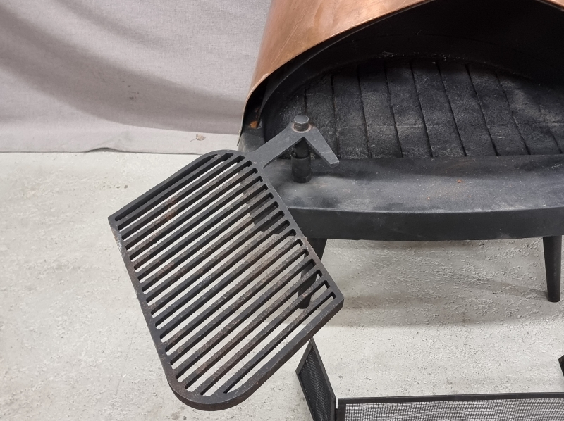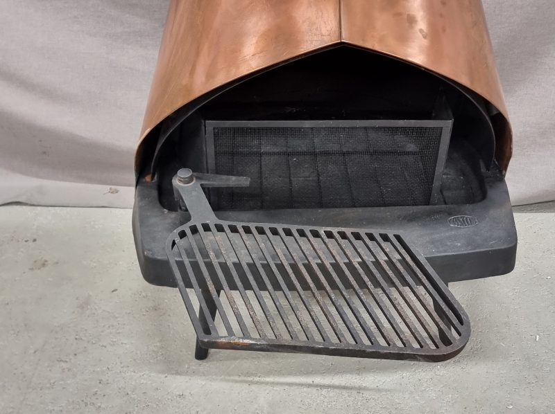 #1882 - Kastor Tevi -takka. Kuparia ja valurautaa. Mukana kipinäsuoja ja takkagrilli