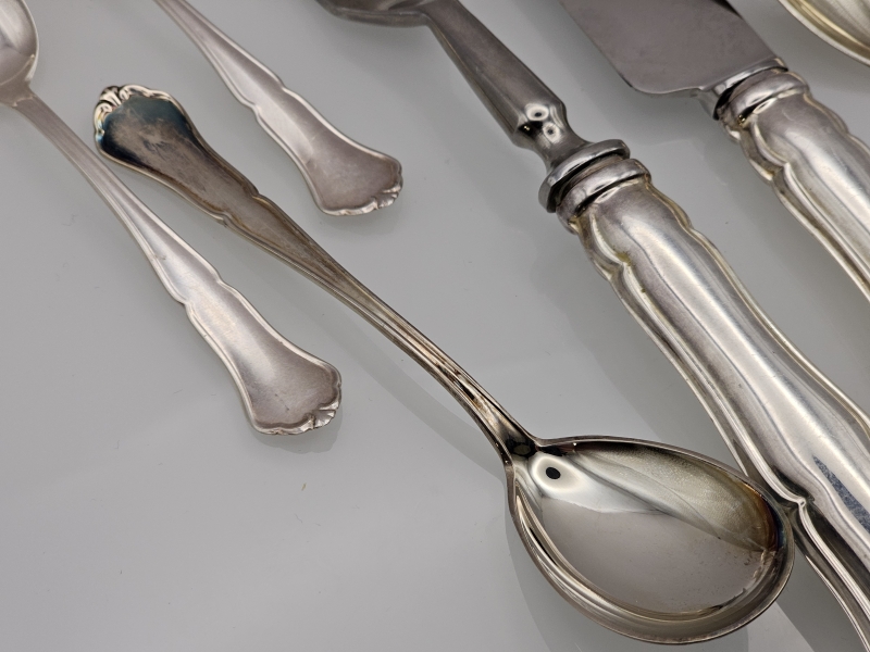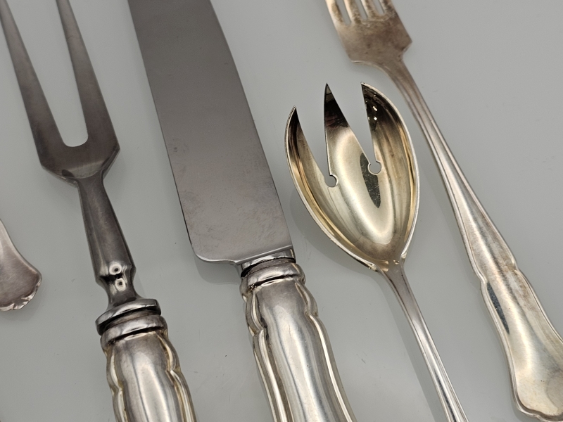 #1462 - Hopeisia chippendale -ottimia + teräskärkinen paistiveitsisetti. Br. 321g