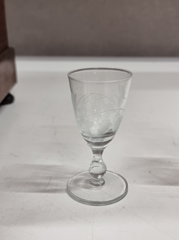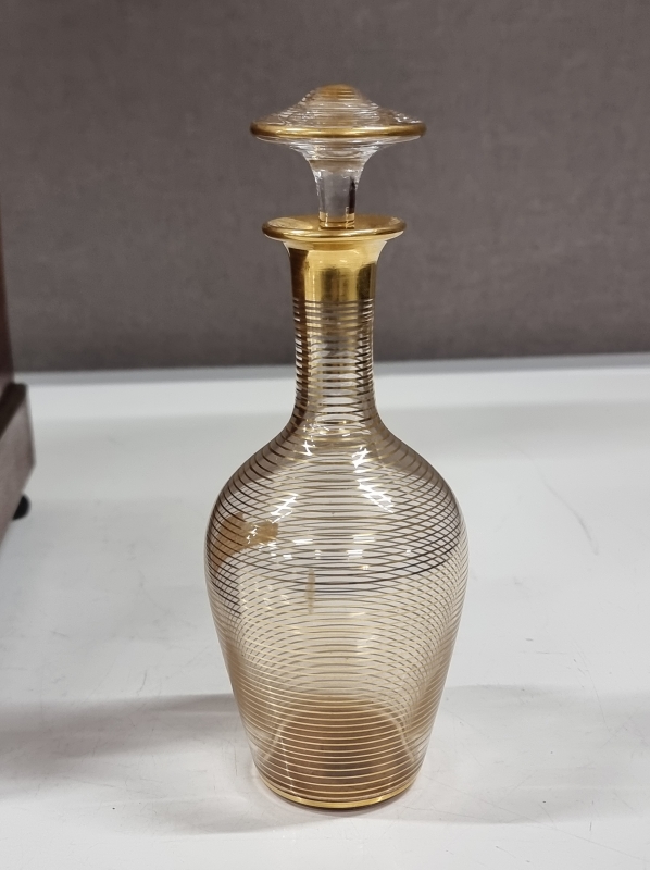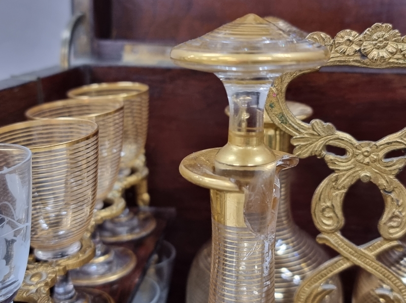 Hieno kokonaisuus, yksi pullo puuttuu, yksi pullo rikki. Avain puuttuu. Kahdenlaisia laseja. Lev.32cm, syv. 25cm, kork. 26cm