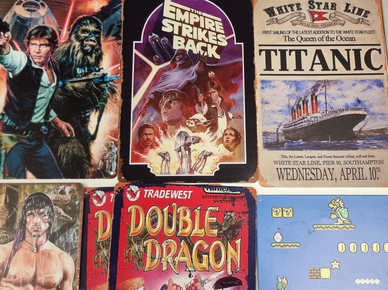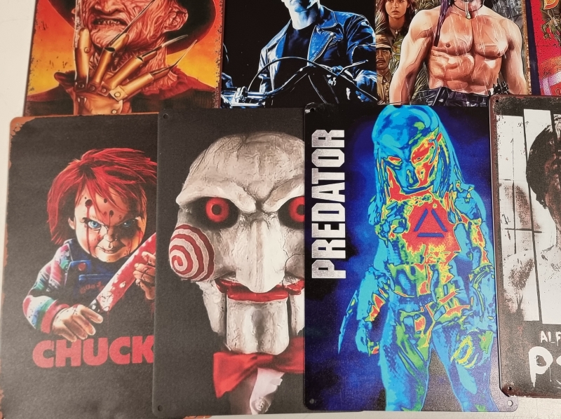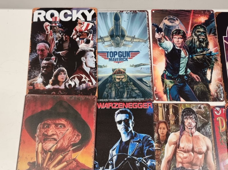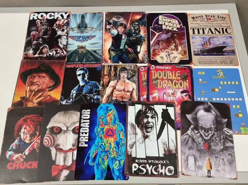 #2416 - 16kpl peltikylttejä, mm. Top Gun, Predator, Psycho