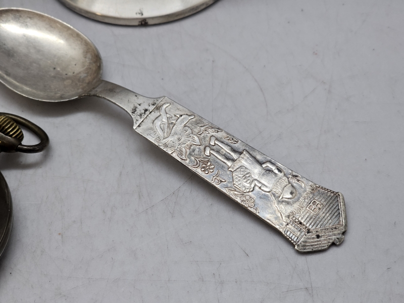 #1611 Erä hopeaa: Lusikka + 2kpl kynttilänjalkoja + taskukello. Br. 406g