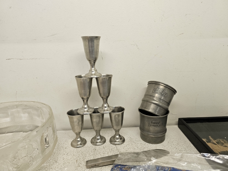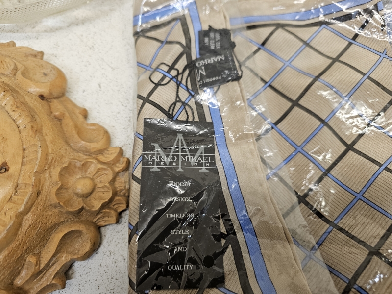 #2178 Erä tavaraa: Mm. 4kpl silkkihuiveja [mm. Marko Mikael design], tinaa, Magisso ym.