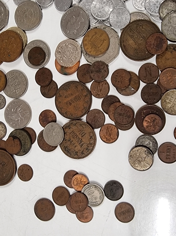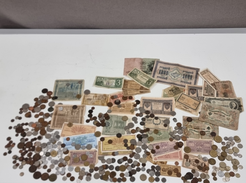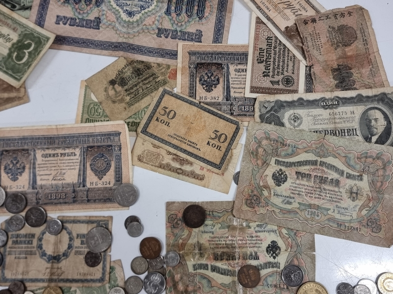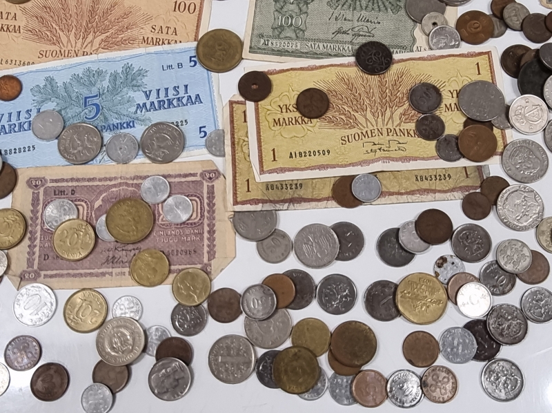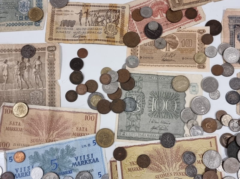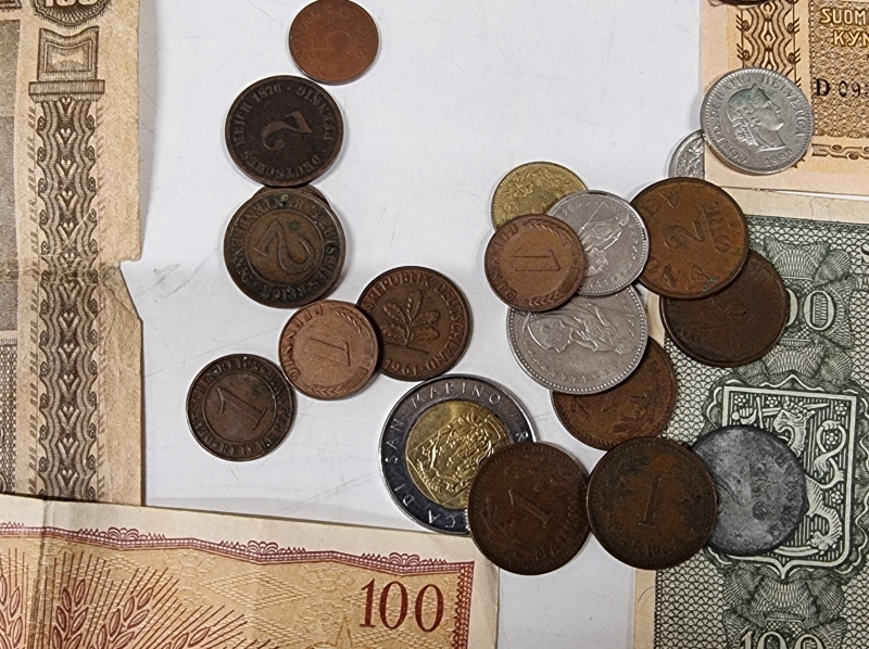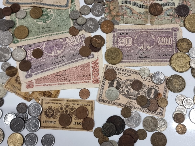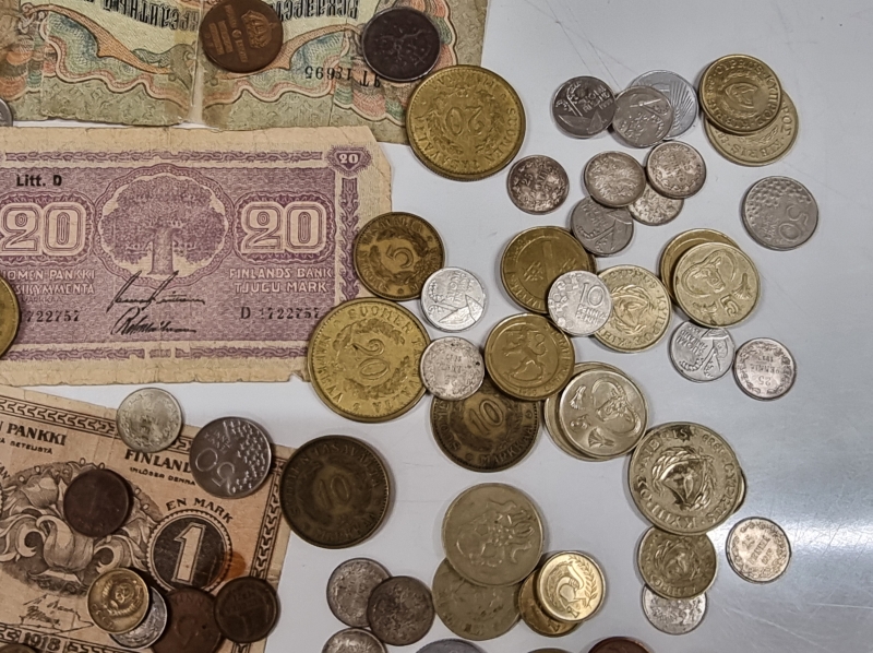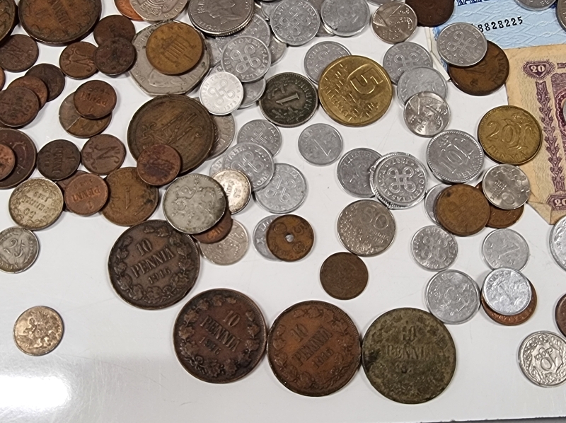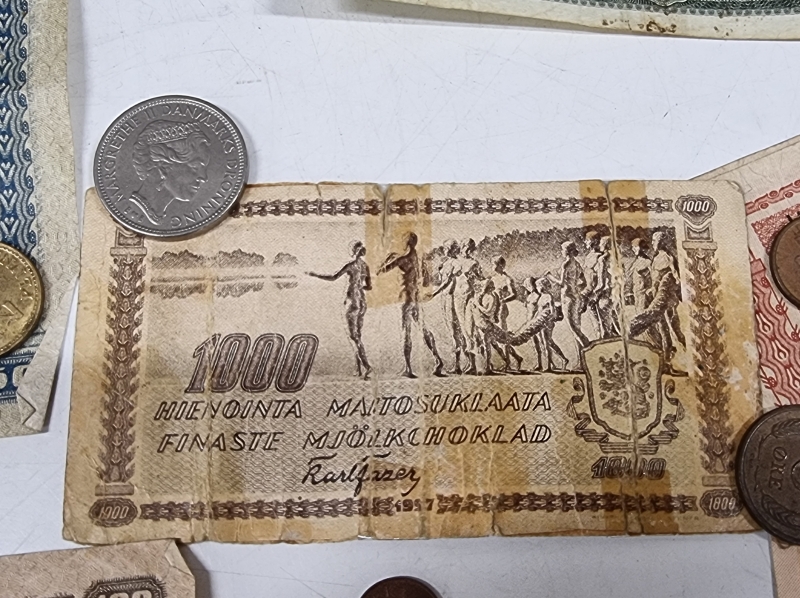#2084 - Iso erä rahoja, mm. "Karl Fazer 1000mk Hienointa maitosuklaata", 5mk seteli v. 1909