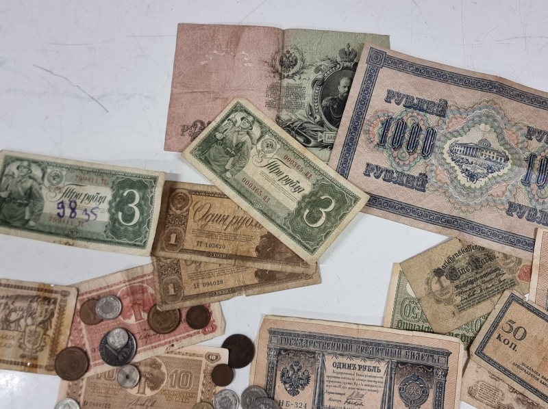 #2084 Iso erä rahoja, mm. "Karl Fazer 1000mk Hienointa maitosuklaata", 5mk seteli v. 1909