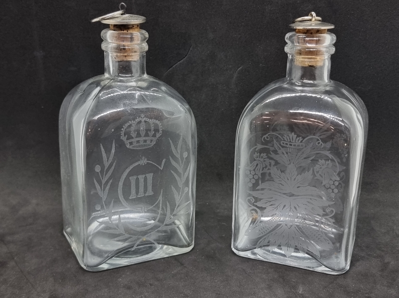 #91 - 2kpl konjakkipulloja, toinen Kustaa III monogrammilla