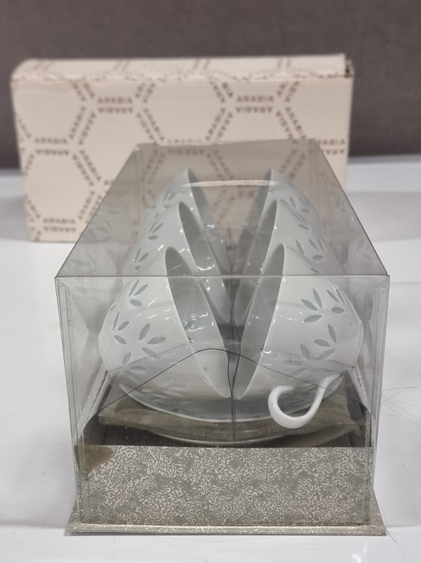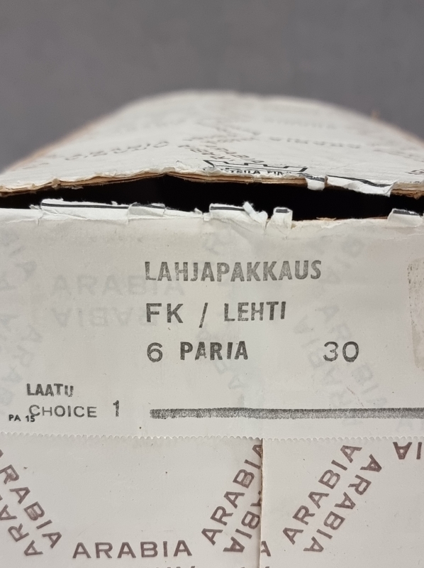 #626 6kpl Arabia riisiposliinikuppia tasseineen alkuperäislaatikossa