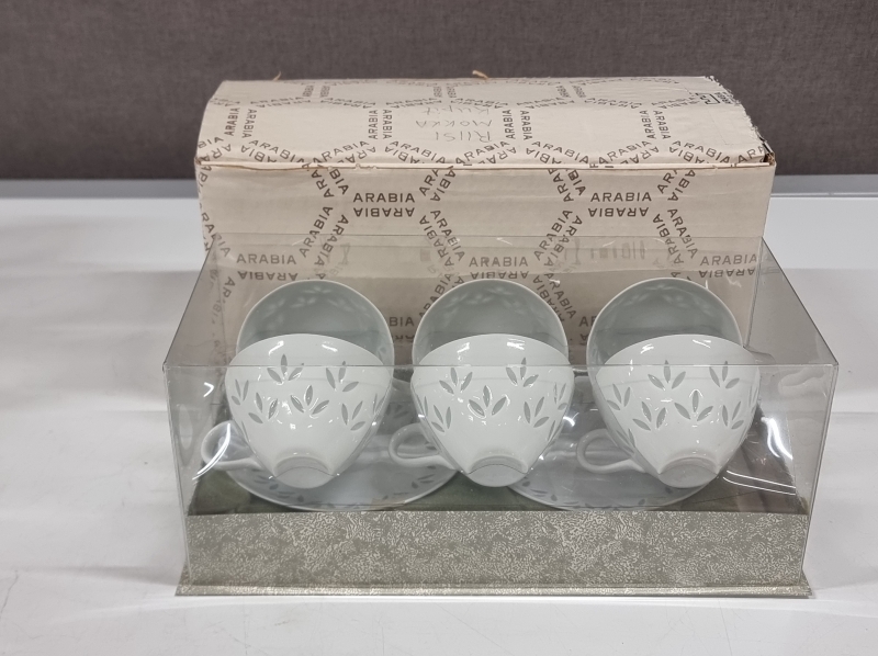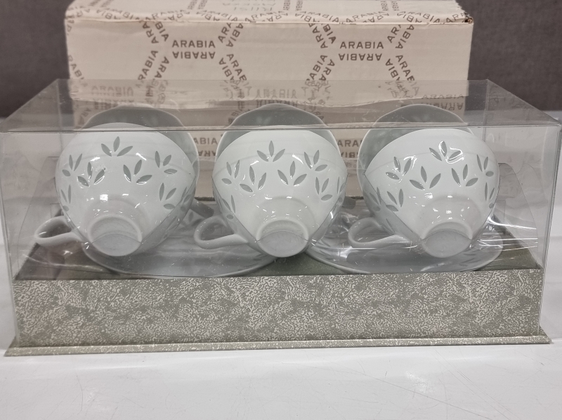#626 - 6kpl Arabia riisiposliinikuppia tasseineen alkuperäislaatikossa