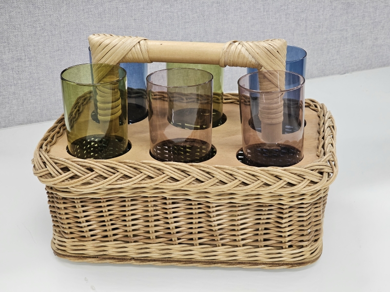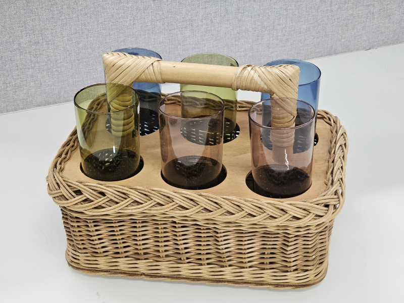 #118 6kpl Tapio Wirkkala mehulaseja rottinkikorissa