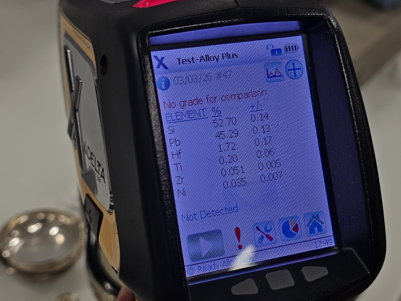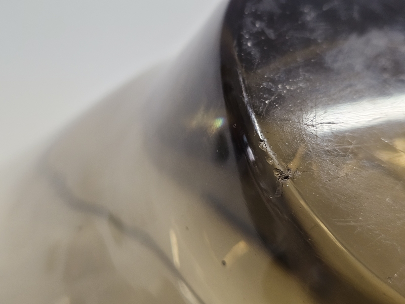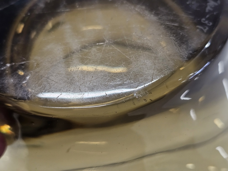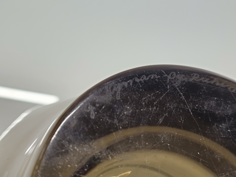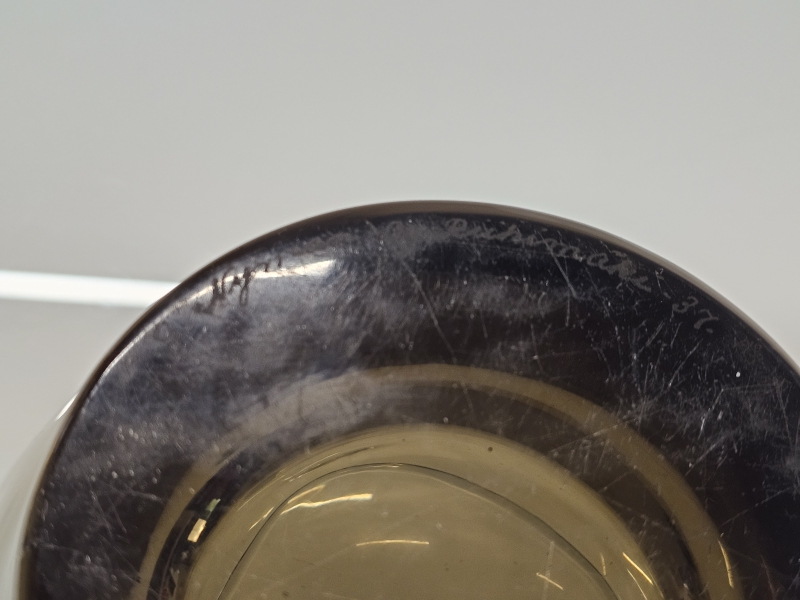 Signeerattu -37. Pohjassa kaksi pientä kolhua. K:19,7cm, noin 27cm x 26cm. Mukana kuvissa XRF-laitteen mittaustulos = lyijyä 45%