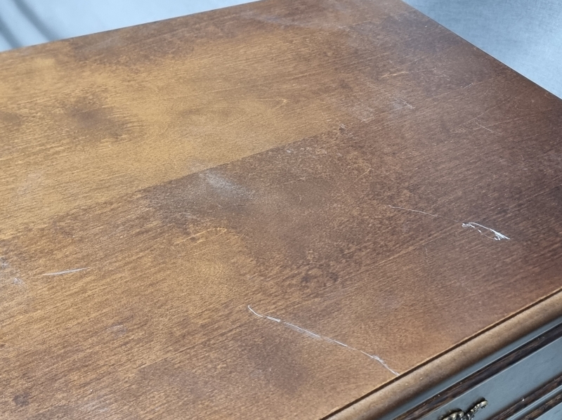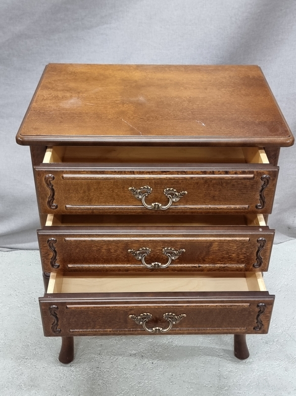 #886 Pikku lipasto kolmella laatikolla, metallisilla vetimillä.
