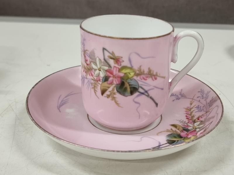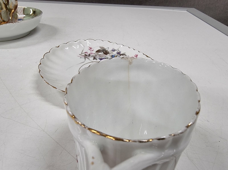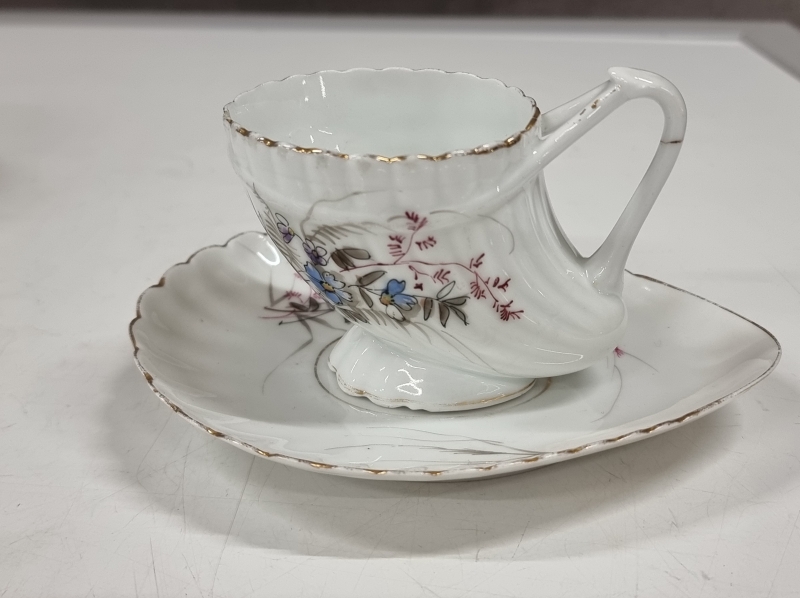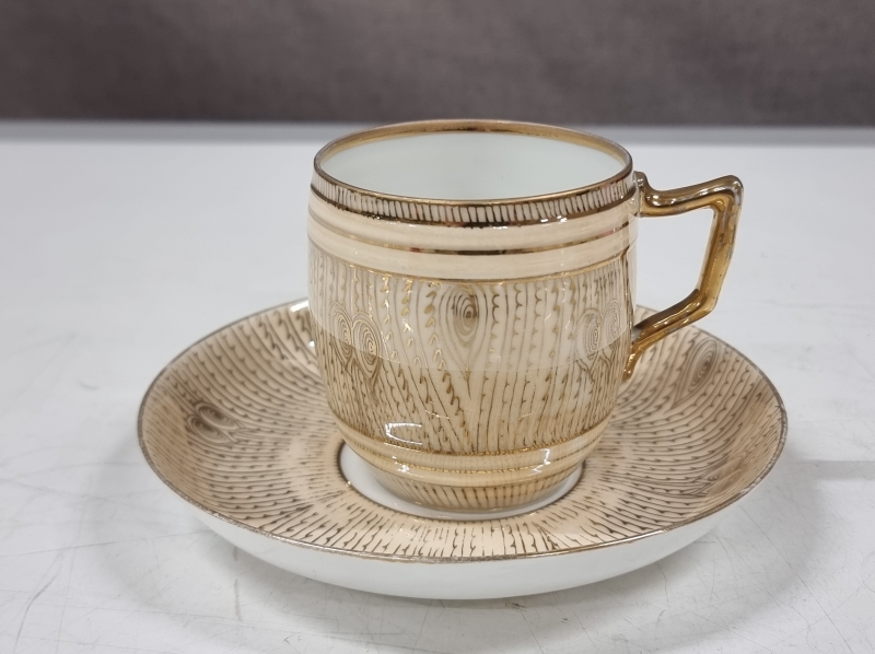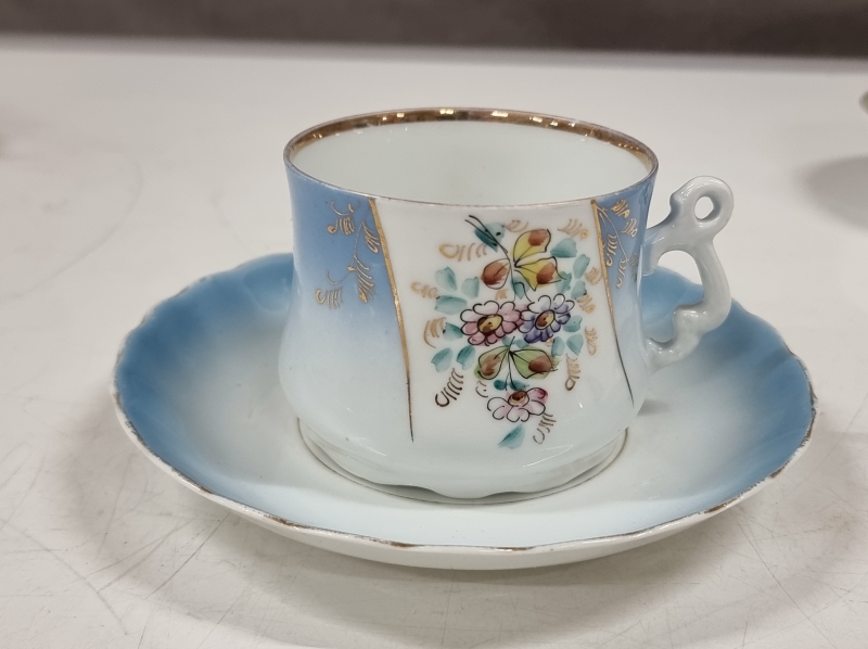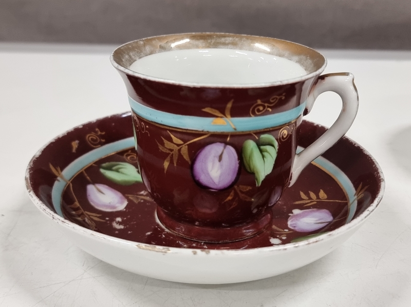 Kultauksissa ja joissain maalauksissa kulumaa, yksi kuppi halki, yhdessä reunavika. Leveimmän kupin halkaisija 9,5cm. Tähän kohteeseen ei postitusta, kysy rahti etukäteen.