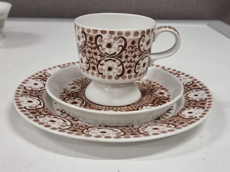 Kolmesta Ali - kupista pala pois, Kruunu - astioissa kulumaa. Isoimman halkaisija 22cm.