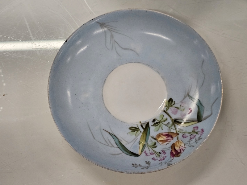 Väreissä kulumaa mutta ei paloja pois. Kupin halkaisija 9cm