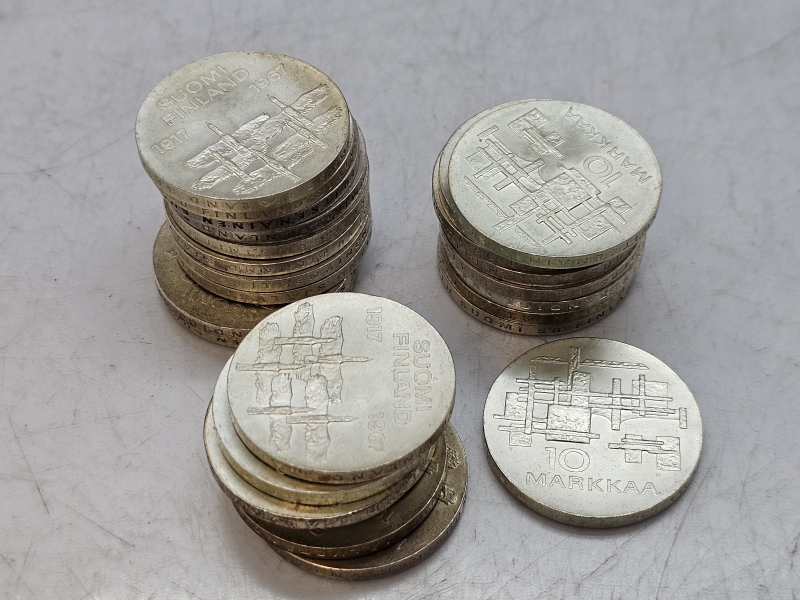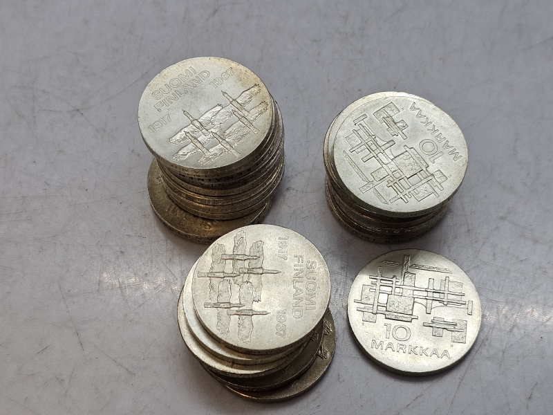 #1203 - 25kpl hopeisia juhlarahoja: 10mk Itsenäinen Suomi 50v. 600g, pitoisuus 900