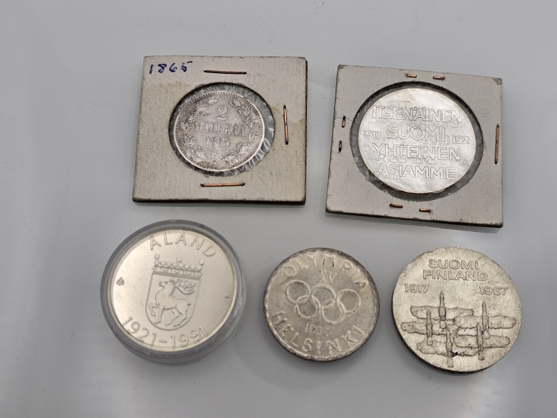 #1064 5kpl hopeisia rahoja: Mm. 2mk 1865, Olympialaiset 1952. Pitoisuus 500-925, paino 88g