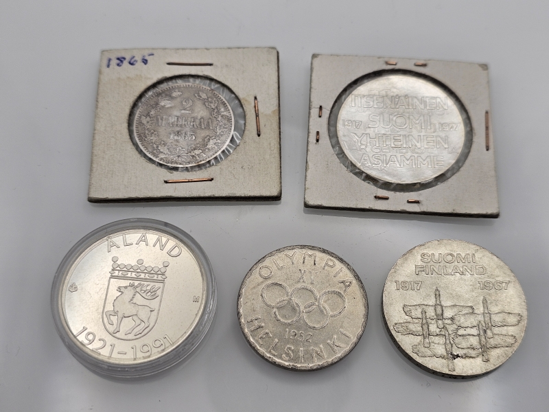 #1064 - 5kpl hopeisia rahoja: Mm. 2mk 1865, Olympialaiset 1952. Pitoisuus 500-925, paino 88g